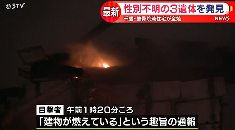 北海道千歳市店舗兼住宅火災 19日午前1時20分ごろ、千歳市日の出5丁目の接骨院兼住宅から出火し、火はおよそ6時間後に消し止められた。 建物は全焼し、焼け跡から3名の遺体が発見された。 写真提供:STV札幌テレビ
