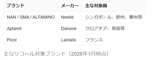 乳児用粉ミルクに有毒物質か? 欧州のネスレ、ダノン、ラクタリスで乳児用粉ミルクに有害物質「セレウリド」が含まれていることから世界60カ国で自主回収がおこなわれている。原料となるアラキドン酸(ARA)油にセレウリドがふくまれており、中国産原料と言われておr、中国・武漢を拠点とするCabio Biotech(嘉必優生物技術)製のオイルに汚染の疑いがある。日本では、この原料を使っていないので安心であるが、個人輸入では問題が残る。