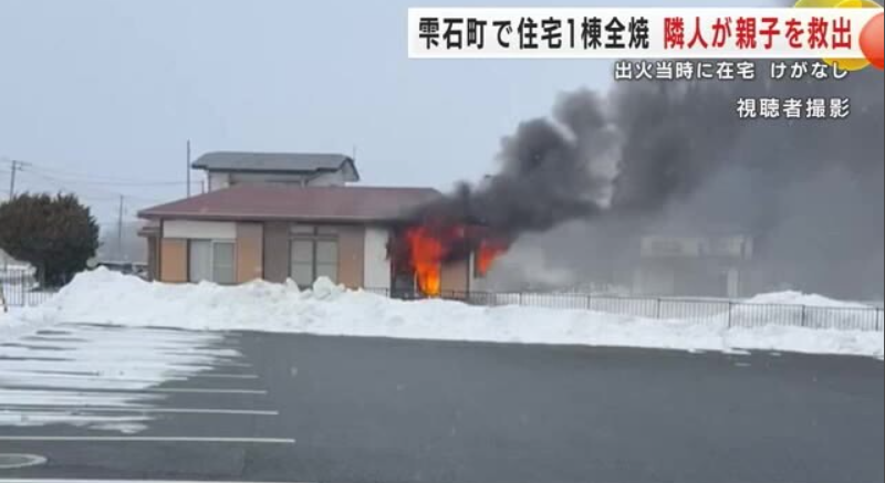 午前2時前に久喜市菖蒲町の木造2階建て住宅から火が出て全焼し、軽乗用車も1台焼けた。