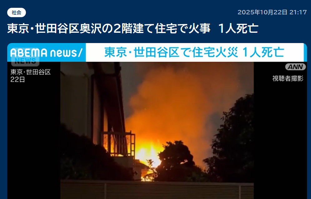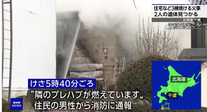 ⑤北海道千歳市住宅火災・・・24日午前9時ごろ、札幌市北区新琴似10条5丁目で木造2階建て住宅から出火し、全焼した。 火災の際、7人が居住していたが、全員逃げて無事。