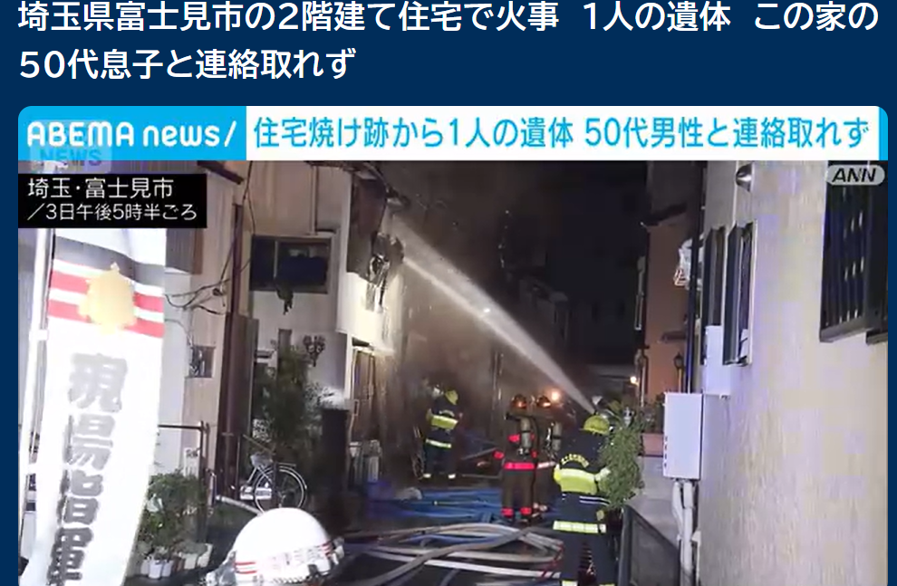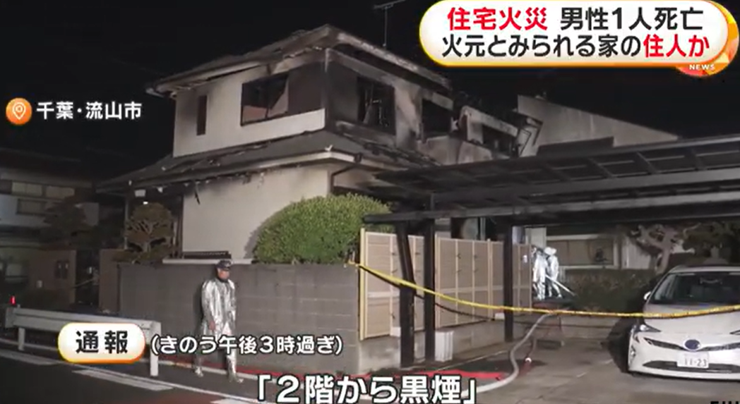①千葉県我孫子市住宅火災・・・ 5日午前5時過ぎ、我孫子市新木野の木造2階建て住宅が全焼し、焼け跡から1名の遺体が発券された。