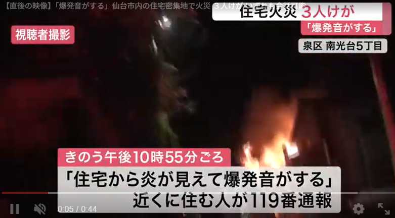 ①宮城県大崎市住宅火災・・・16日午後5時半ごろ、大崎市岩出山下野目の木造平屋建て住宅から出火し、消防車等8台が出動し、火は約1時間半後に消し止められた。