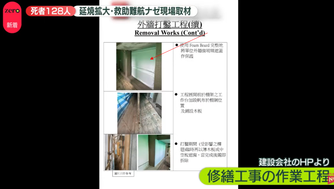 12/2現在、死者数154人、行方不明者50人となっている。火災が拡大した原因としては、一部報道で足場のネットが可燃性であると言われていたが、大部分は、防炎性能があったという。防炎性能は、一般的には、45度燃焼試験であるが、こういう垂直に貼ってある場合は、垂直試験で寄り燃えやすい状態となる。また、窓枠に発泡スチレンボードが貼ってあるのは、どうやら外からのごみ等がはいりにくくするためのようで、工事指図書にも記載されている。このような可燃性ボードを窓に貼っておくことは普通はかんがえられない。今後の調査結果を待ちたい。