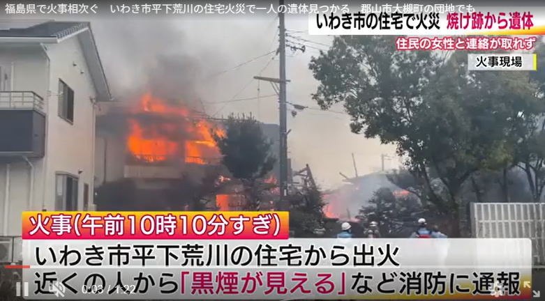 ③福井県大野市住宅火災・・・22日午後6時20分ごろ、大野市若杉町の木造2階建て住宅から出火し、火は約2時間後に消し止められた。建物jは全焼し、